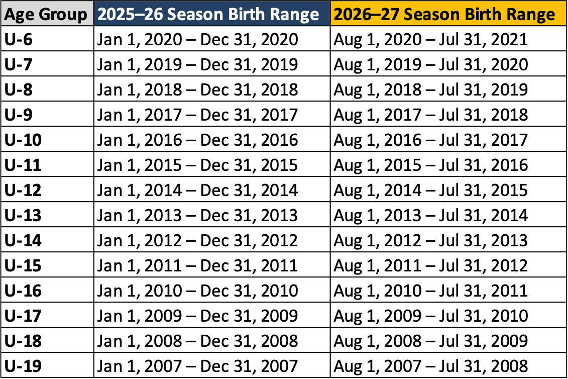 Starting in the 2026-27 Season, US Soccer will move from birth year to grade level, due to this, some players will be the same level for 2 years (birthdates August 1 - December 31).
